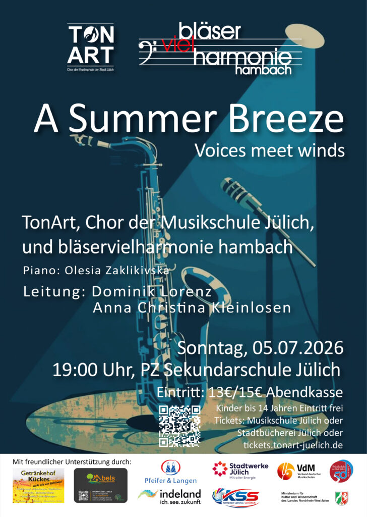 Am 18. April 2026 ist es endlich soweit: Der Ticket-Vorverkauf unseres diesjährigen Sommerkonzerts „A Summer Breeze – Voices meet winds“ startet und wir freuen uns, euch gemeinsam mit der bläservielharmonie hambach ein abwechslungsreiches Programm präsentieren zu dürfen!